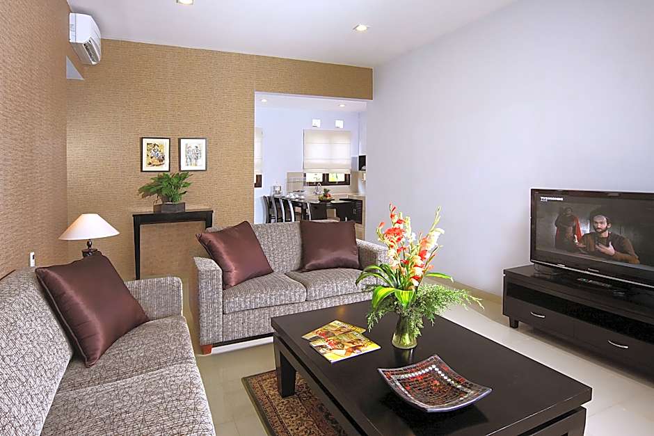 This family room features a living room and a kitchenette with a dining area. Each bedroom has an private bathroom with a bath and shower facilities.